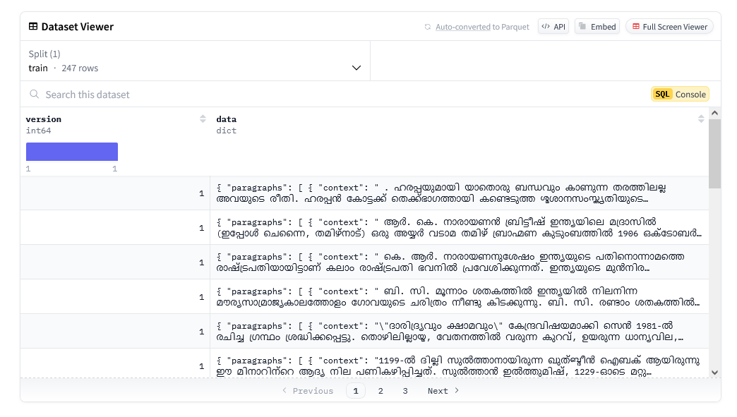 The model used is Meta’s Llama 3.2 3B instruction tuned model [1]. The dataset of Malayalam question answer pairs is prepared from ai4bharat’s Indic language Question Answering dataset [2]. The code takes advantage of HuggingFace’s Transformers library to configure, train and publish the model and the `peft` library for efficient finetuning of the model using Low Rank Adaptation (LoRA) [3].